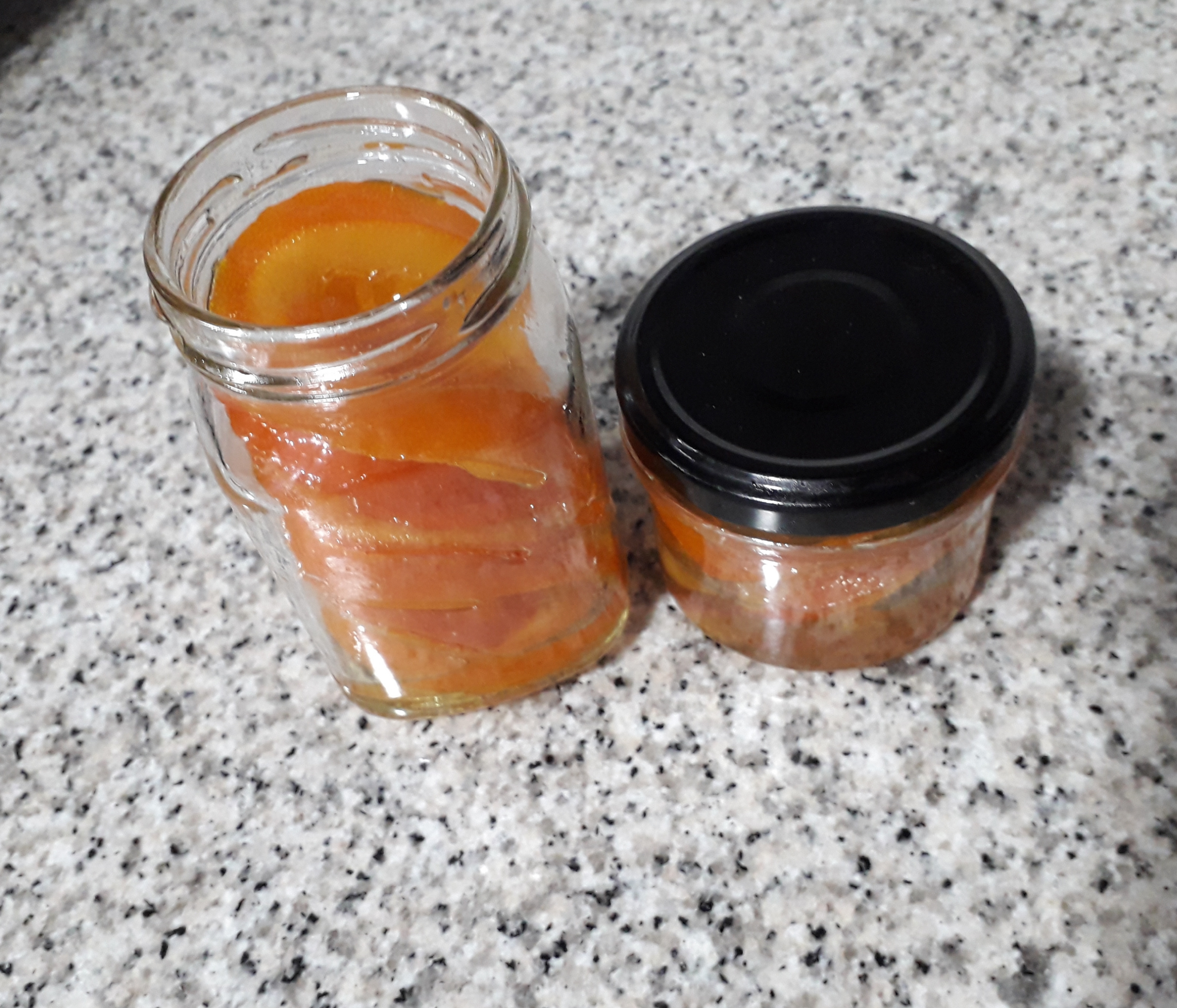 Se lavan bien las naranjas y se cortan a rodajas finitas. Se ponen en un cazo con agua y sal, que hiervan unos 3 minutos es suficiente. Retirar del fuego y colarlas bien. Lavarlas con cuidado con agua fría ( con cuidado porque si son finas las rodajas se pueden deformar). Con este procedimiento se les quita un posible amargor.